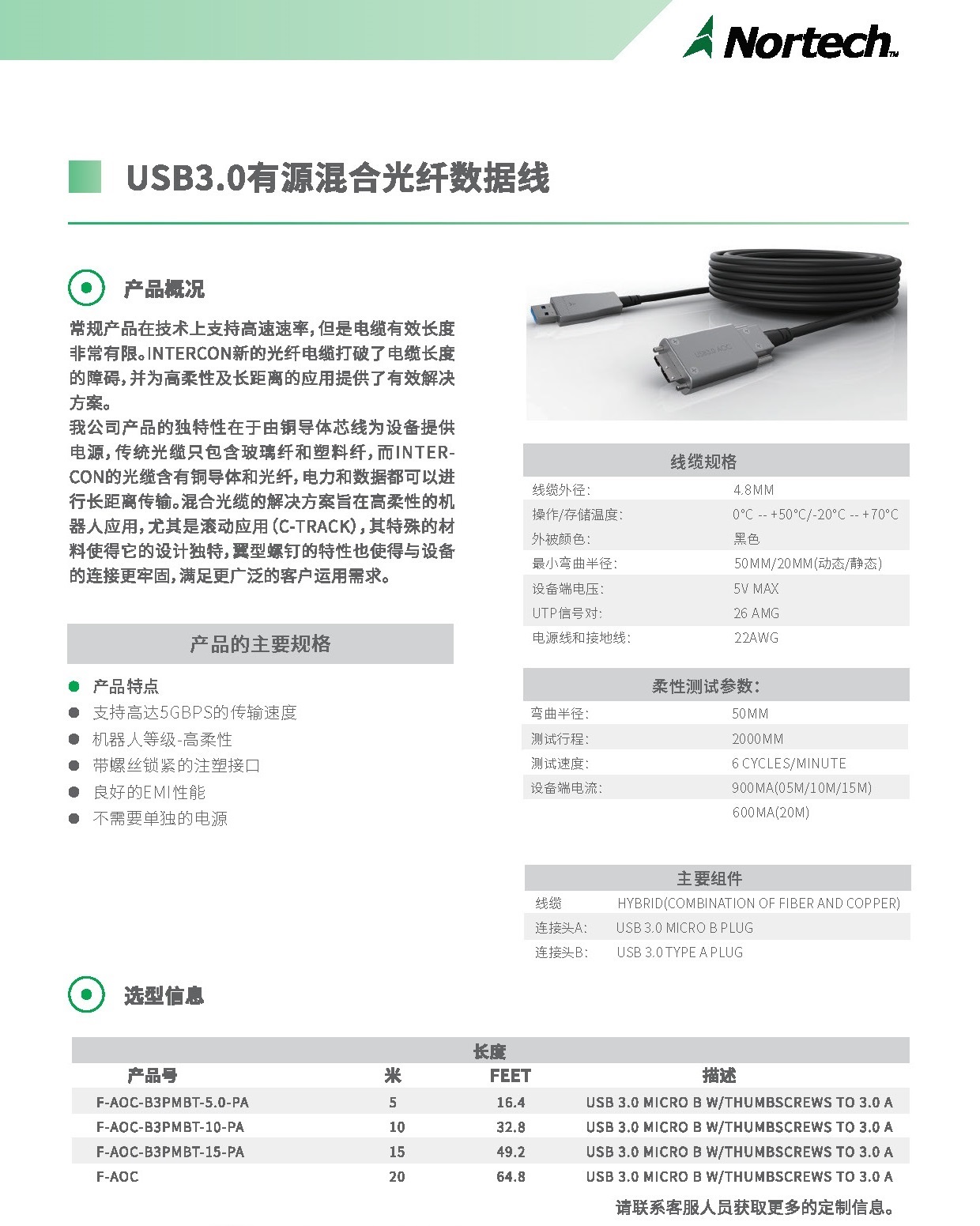 为了弥补普通 USB3.0 有源光纤数据线无法给设备供电的缺陷,北科推出了新一代的 USB3.0 有源混合光纤数据线(U3HC)。在采用光纤作为传输介质的基础上,集成铜缆以达到给设备供电的目的。目前在不增加任何中继设备的情况下,混合光缆长度可达 20 米,非常适用于不具备现场供电能力的应用场合,比如机器视觉领域,远程监控领域等。